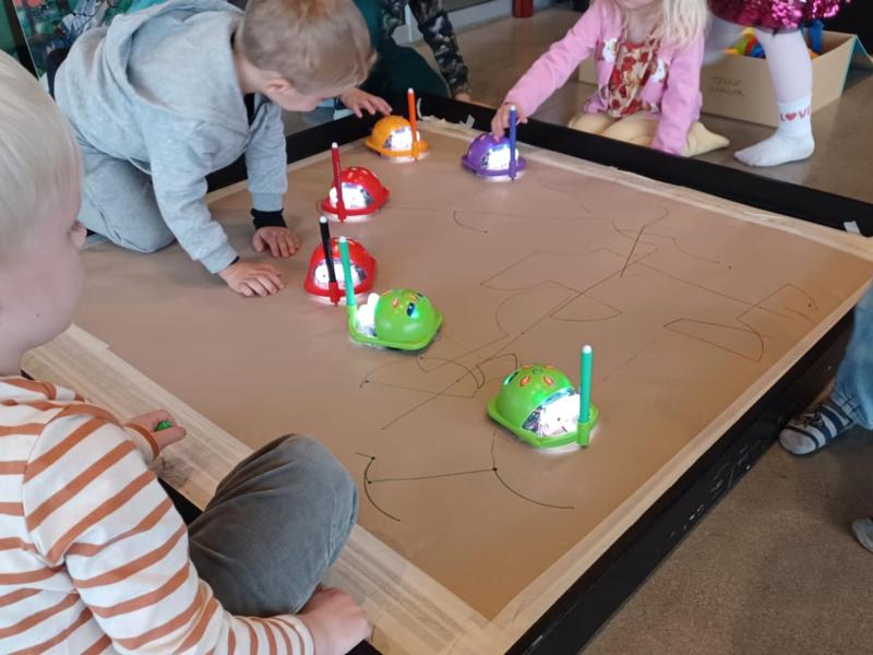 Bagefter finder vi en anden lille robot frem, nemlig Blue-Bot. Vi giver robotten en tegneskal på ryggen og programmerer den, så vi sammen kan lave den fineste robot-krusedullekunst.